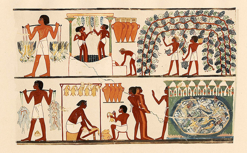 En Egipto, a orillas del Nilo, también se empezó con producción del vino de acuerdo a algunas de sus pinturas; y a parte de bebida en los banquetes, era muy utilizado como ofrenda a los muertos y en la libación (rito religioso que consistía en derramar determinado líquido sobre el suelo en ofrenda a los dioses). Y fue hasta Grecia, cuando se empezó a cultivar más en forma la vid, y el vino empezó a ser anfitrión de los grandes banquetes. Aquí surge Dionisio (Dios del vino) y las mezclas de vino con especias, agua de mar, miel o resina para enmascarar su sabor un poco porque decían que solo los dioses podían tomar vino puro; y también para alargar su conservación. Por esto mismo, el vino queda reservado para las clases privilegiadas y el pueblo bebía orujo rebajado con agua o cerveza.