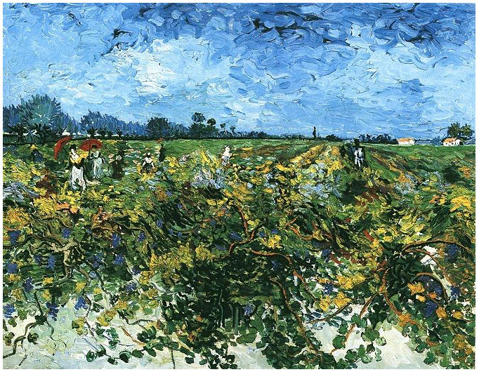 «El viñedo verde», a diferencia del anterior, muestra aquí tonos fríos de azules y verdes. El cielo me parece magnífico, típico de un Van Gogh; expresivo y en movimiento. Las vides en su mayor esplendor del envero*; de hecho se pueden notar algunos racimos azulados colgando. Las mujeres entre las vides no parecen campesinas, sino damas paseando con sus sombrillas para protegerse del sol. La línea del horizonte delimitada en el primer tercio de la pintura le da un balance que nos permite enfocarnos más en la abundancia del viñedo. Y hasta bajo, los rebeldes brazos de las vides se expanden en el suelo, parecieran también ser un reflejo en un tipo espejo de agua. El cuadro me inspira jovialidad y dinamismo, y me remonta al placer de pasear entre viñedos.