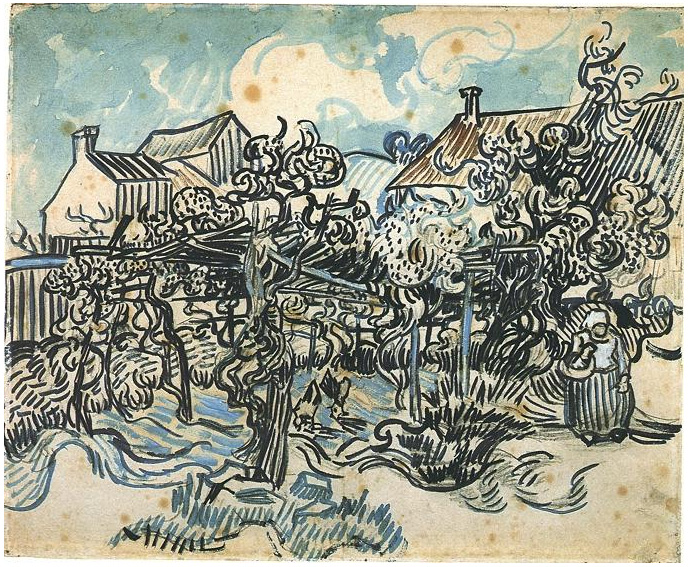 «El viejo viñedo con mujer campesina», es para mi muy interesante, creo es más como un estudio que una pintura. Incluso me atrevo a decir que es lo que ahora se denomina «sketching»*, con algunos tonos de azul y algunas notas amarillas. Lo que me encanta es que es un viñedo emparrado* y que los brazos de las vides son espirales dinámicas como zarcillos*. La mujer campesina se encuentra hierática*, como si el tiempo se hubiese llevado su alma. Eso mismo me hace sentir, el paso del tiempo.